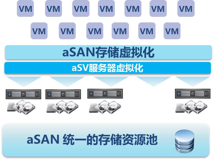 存储虚拟化aSAN,基于集群设计,将服务器上的硬盘存储空间组织起来形成一个统一的虚拟共享存储资源池,即ServerSAN分布式存储系统,进行数据的高可靠、高性能存储。分布式存储系统在功能上与独立共享存储完全一致;一份数据会同时存储在多个不同的物理服务器硬盘上,提升数据可靠性;此外,再通过SSD缓存,可以大幅提升服务器硬盘的IO性能,实现高性能存储。同时,由于存储与计算完全融合在一个硬件平台上,用户无需像以往那样购买连接计算服务器和存储设备的SAN网络设备(FC SAN或者iSCSI SAN)。