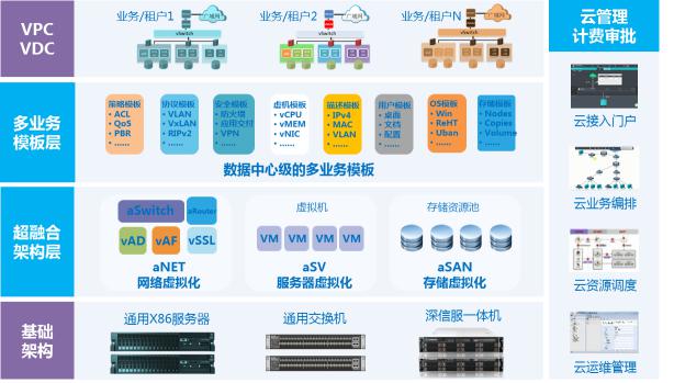 的超融合架构解决方案软件架构主要包含三大组件(服务器虚拟化aSV、网络虚拟化aNet、存储虚拟化aSAN)和一个管理平台(虚拟化管理平台VMP)。硬件架构上,可以通过一体机的方式实现开机即用,也可以采用通用X86服务器实现基础架构的承载。配合传统的园区网交换机(背板带宽和交换容量够用即可)即可完成整个平台的搭建,无需各种功能复杂、价格昂贵的数据中心级交换机。