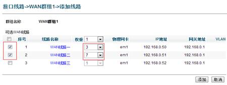 线路群组,对多线路进行聚合放大带宽(小ISP低费用租用ADSL聚合实现光纤链路效果,可支持500条ADSL的汇聚)。通过将多条出口链路加入进一个群组,在群组中通过设置权重,动态分派各线路的流量比重,达到线路均衡的目的。添加如下:
