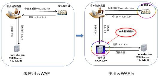 之所以称之为云WAF,就是因为它所有的WAF功能都是通过云端提供的,而不需要在本地部署产品。实现这点主要利用的就是DNS技术。