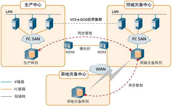在网络层,同城双中心之间采用光纤连接,保证双中心之间较大的带宽,以响应实时的业务数据需求,同城异地之间采用专网或IP广域网即可实现,以节约成本。同城双中心的光纤采用波分复用(WDM)技术进行建设,针对两地只有1条或2条光纤连接的场景,采用WDM方式,能够虚拟出多条FC或GE联络,满足两地之间对业务和数据多重链路的需求。WDM技术能充分利用光纤的巨大带宽资源,大幅度提高系统传输容量,降低传输成本,因此在长途和骨干网的超大容量传输中得到了广泛的应用。将WDM技术引入城域网、接入网,整个网络就会变成无缝连接的整体,为所有不同的业务提供支持和连接,因此城域网中WDM具有很大优越性。