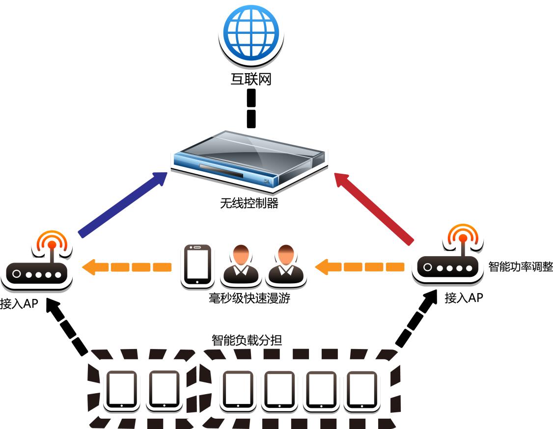 WAC无线控制器可智能实时的根据用户数和流量将接入终端调整分配到不同的接入点,平衡负载压力,极大的提高无线网络的容量和连接可用性。同时2.4G和5G之间可实现自动负载,提升无线接入质量。