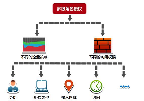 针对XXX公司存在很多个部门,有不同的角色对象,企业办公无线解决方案对用户进行多级的角色授权,根据不同角色分配不同的访问和流控策略。